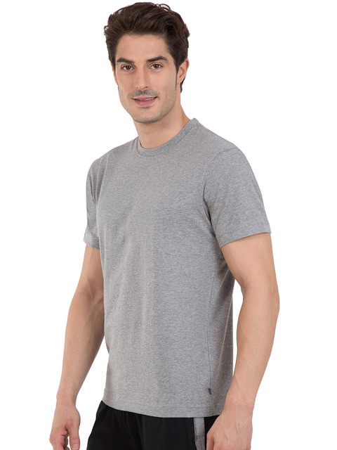 Grey melange solid T-shirt, has a ribbed crew neck, and short sleeves
