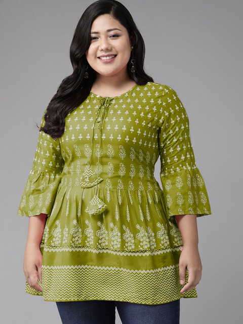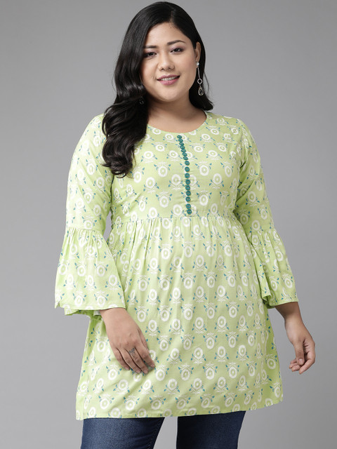 YASH GALLERY Plus Size Green & Off White Floral Print Bell Sleeves Kurti