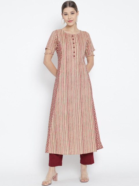 YASH GALLERY Maroon & Beige Striped Printed A-Line Kurti