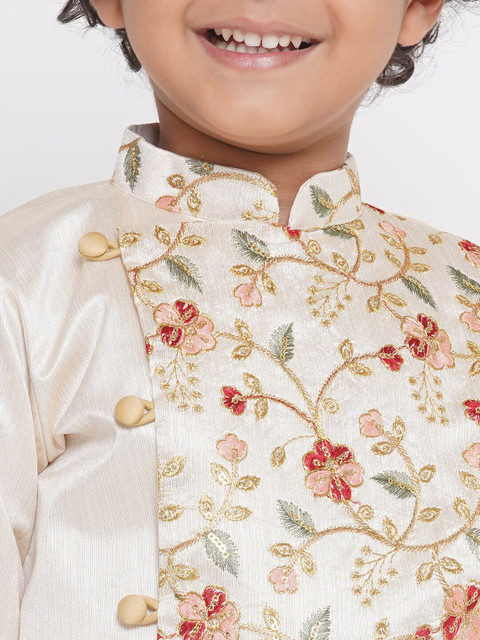 Cream coloured & red floral embroidered sherwani, has a mandarin collar, has side button closures, side slit and long sleeves