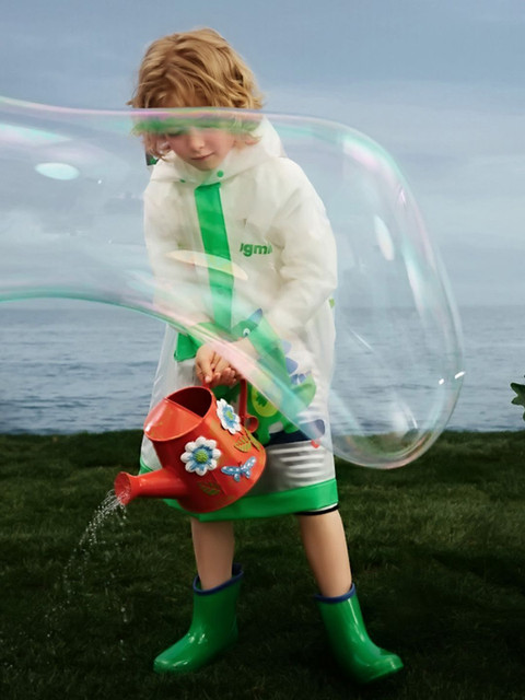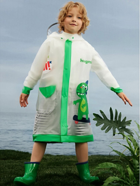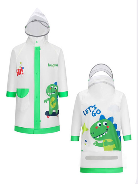 Greem printed rain coat, has an attached hood, seam sealed with adjustable hems, button closure