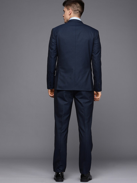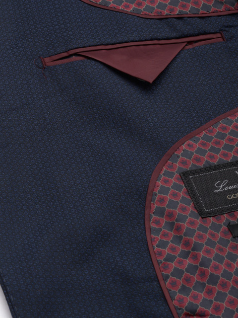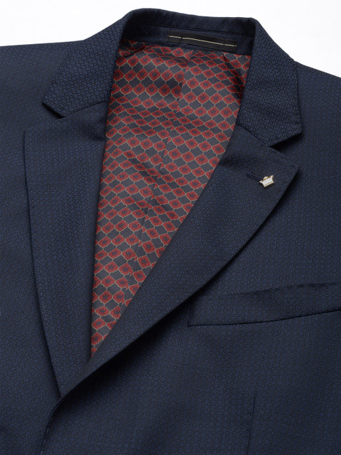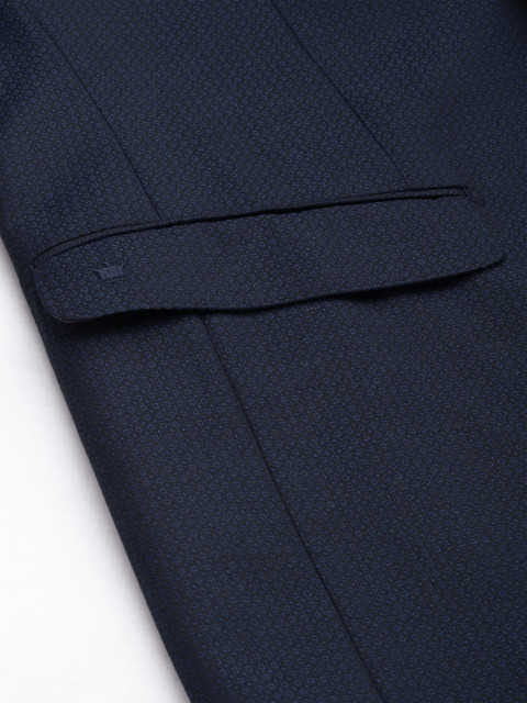 Navy blue self design slim fit blazer, has a notched lapel, single-breasted with button closure, long sleeves, one welt pocket, two flap pockets and double vented back hem