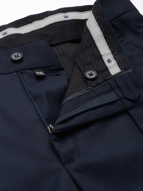 Navy blue self design slim fit mid-rise trousers, has a zip fly with button closure, four pockets