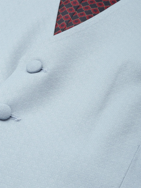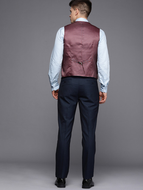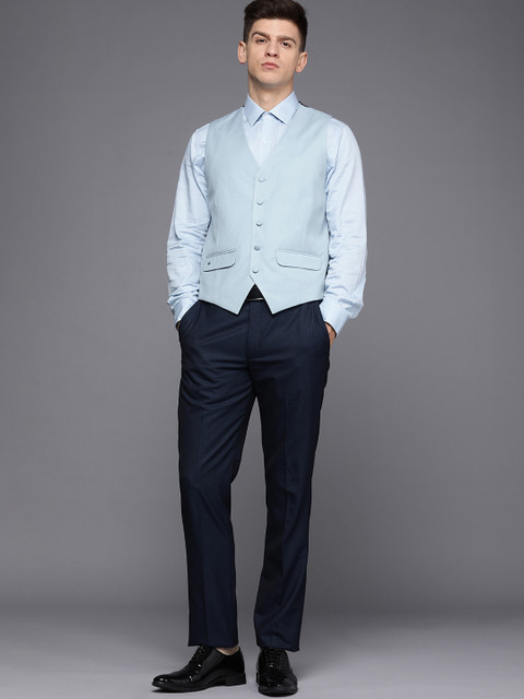 Blue self design slim fit waistcoat, sleeveless, has full buttoned placket
