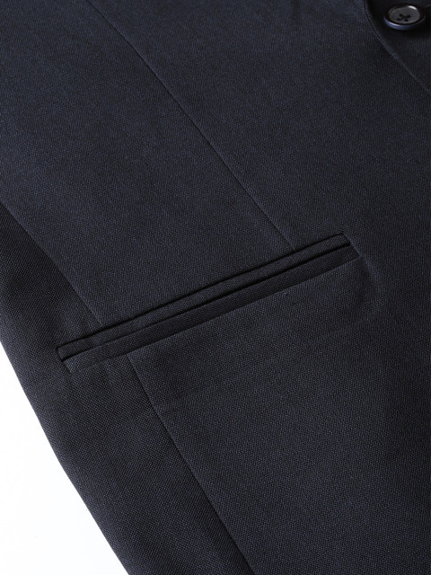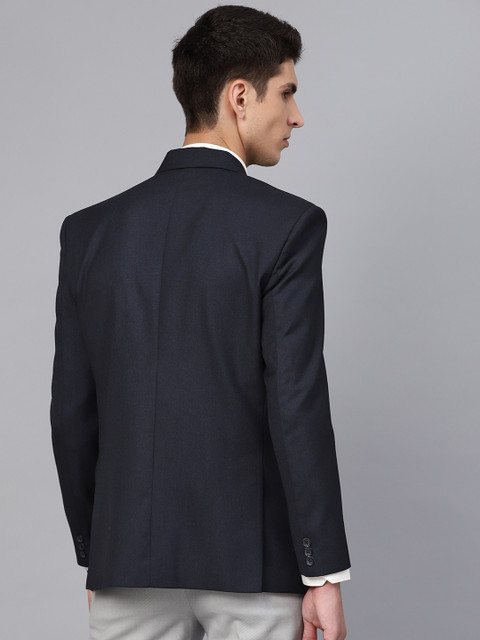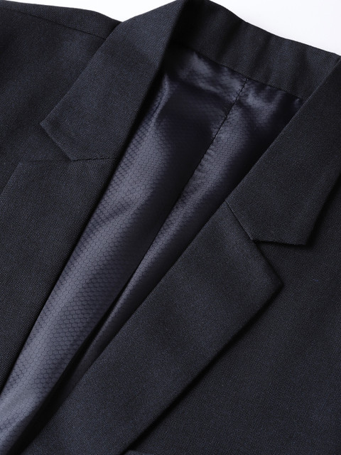 Navy blue solid single-breasted formal blazer, has a notched lapel collar, button closure, long sleeves, three pockets, an attached lining with two in-built pockets and a double vented back hem