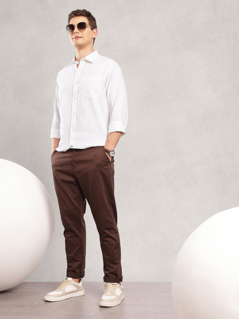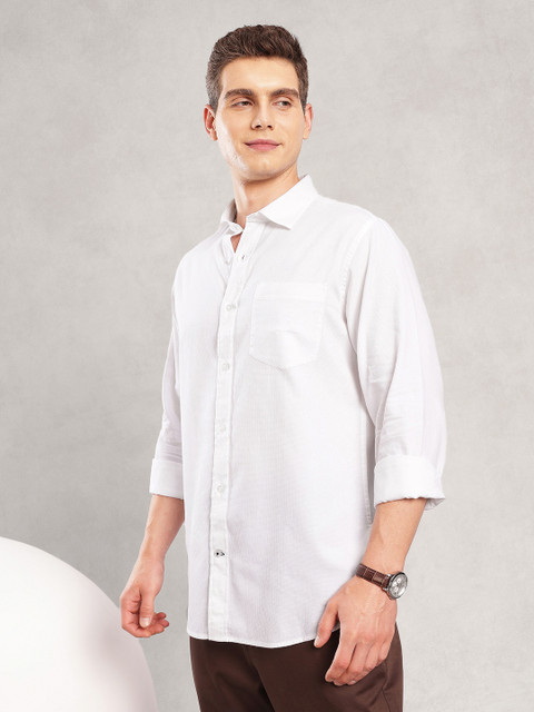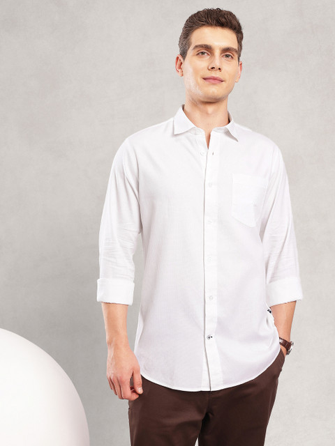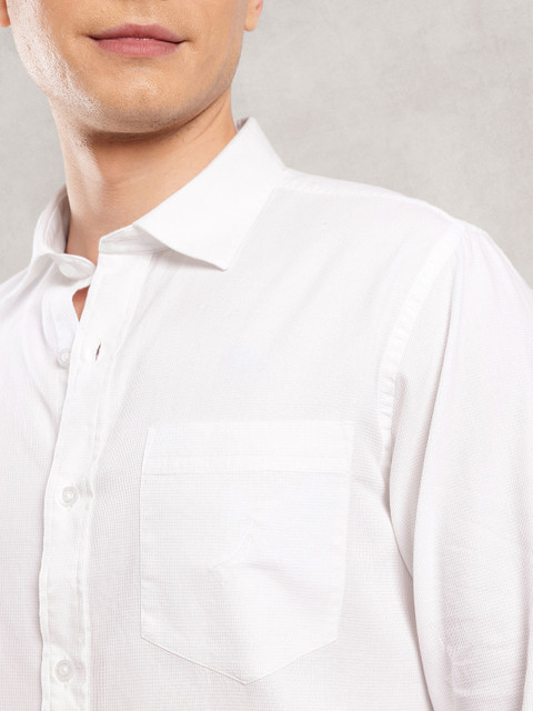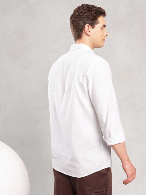 White solid opaque Casual shirt ,has a spread collar, button placket, 1 patch pocket, long regular sleeves, curved hem