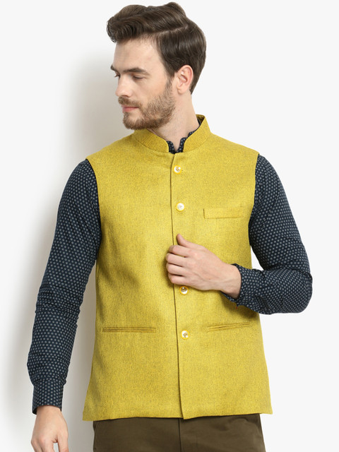 Vastraa Fusion Men Yellow Solid Woven Bandhgala Nehru Jacket