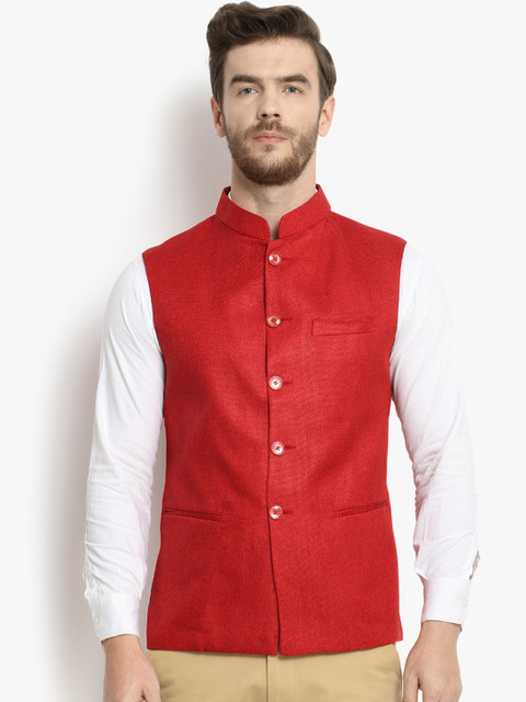 Vastraa Fusion Men Red Solid Woven Nehru Jacket