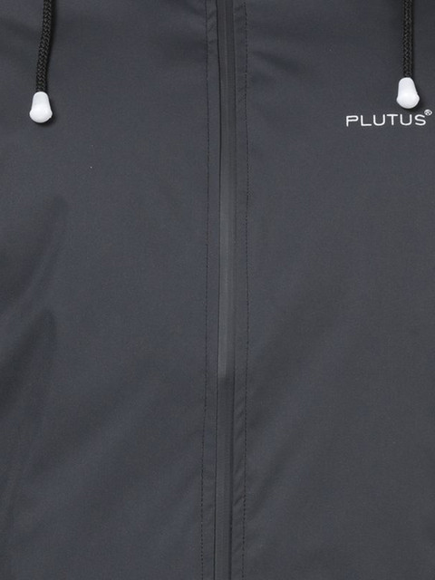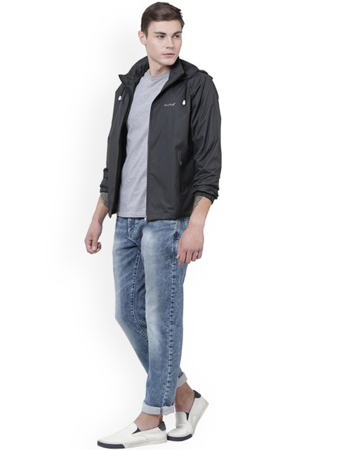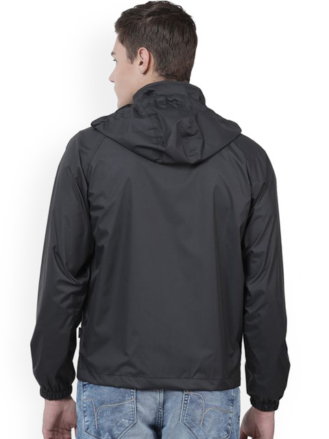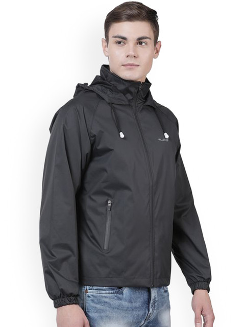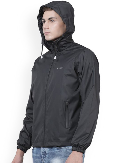 Black solid rain jacket, has a self-attached hood that comes with a drawstring toggle and zipper closure and long sleeves