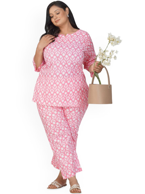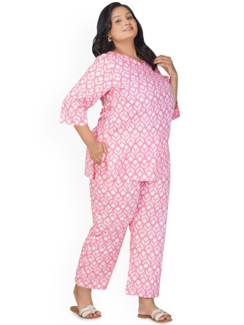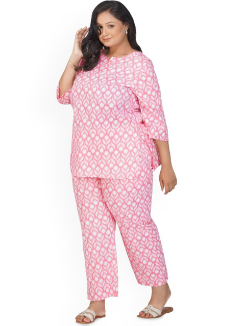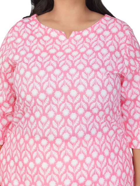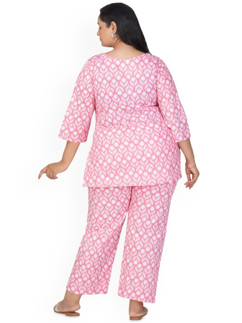 Pink and white printed tunic, has a notch neck and three quarter sleeves, secured with slip-on closure