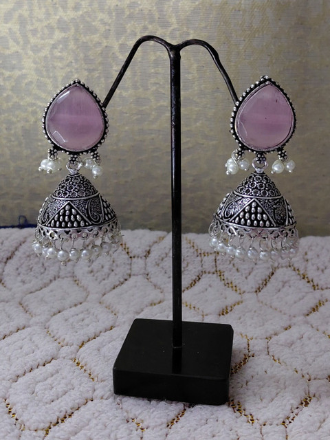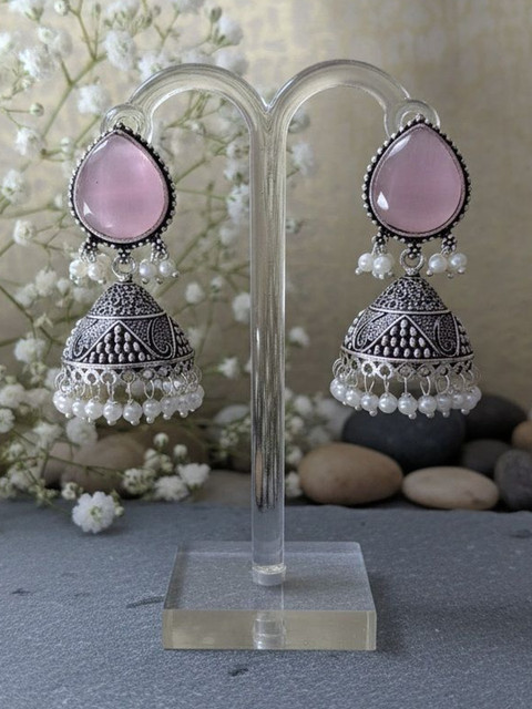 Silver-toned teardrop shaped jhumkas, silver-plated, has artificial stones and beads