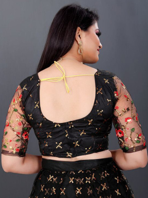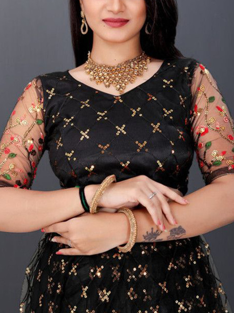Black and gold-toned embroidered unstitched blouse, has a v-neck, short sleeves, black and gold-toned embroidered semi-stitched lehenga, flared hem