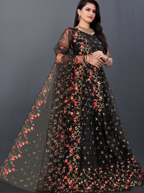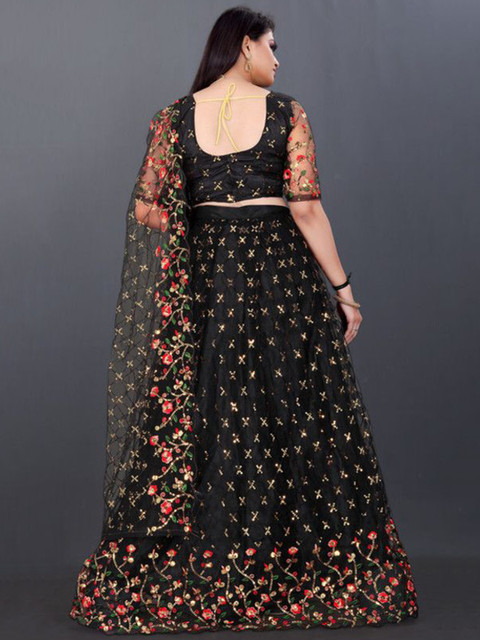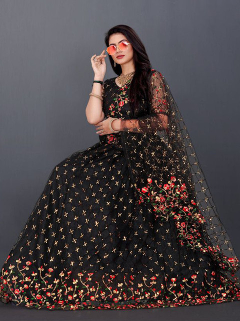 Black and gold-toned embroidered lehenga choli with dupatta,