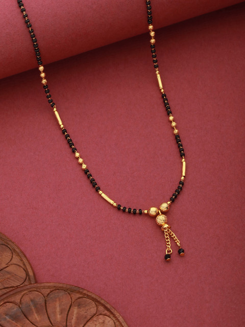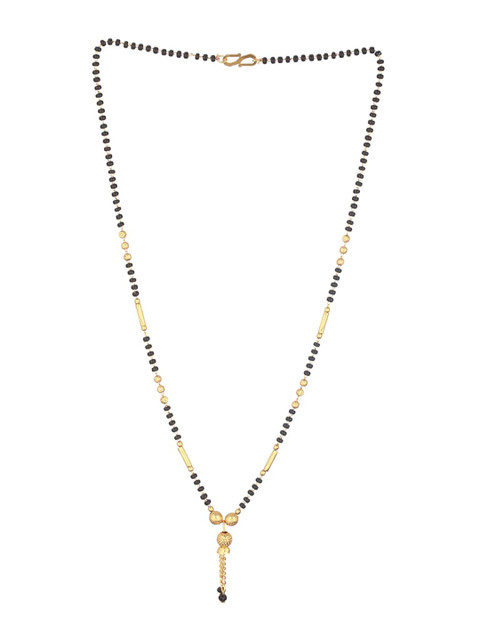 Gold-plated black beaded mangalsutra, has a stylized centrepiece details