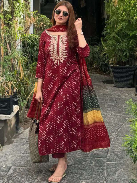Maroon, white and green printed Kurta with Trousers with dupatta