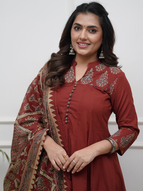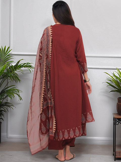 Rust printed kurta with trousers & dupatta