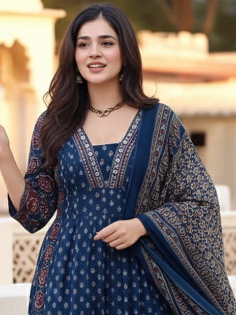 Navy blue printed Kurta with Palazzos with dupatta