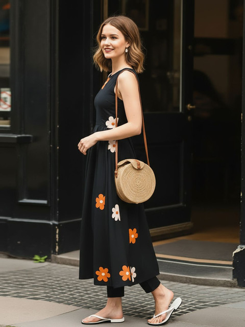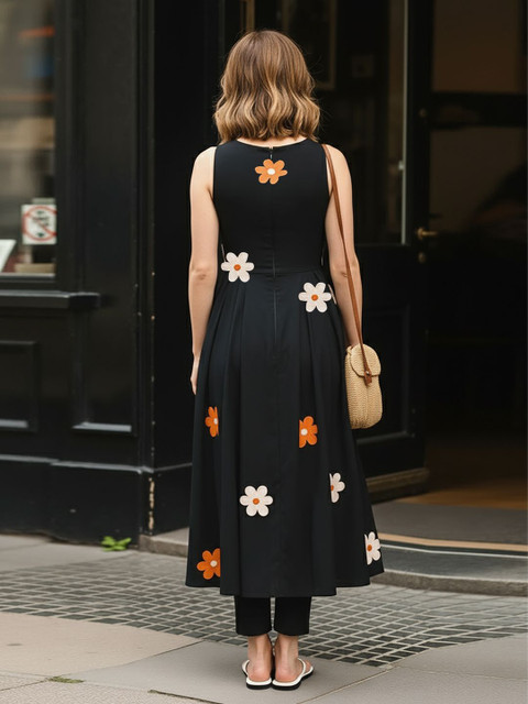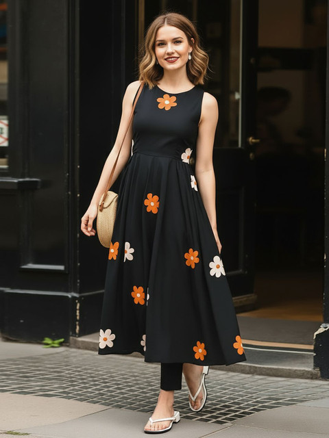 What a beautiful black kurti . It has beautiful flowers on it. Design is so different and pretty. Fitting is good . Fabric is also good . Pair it with black pants or trousers and black heels and what a cute outfit it will become . I am wearing size M