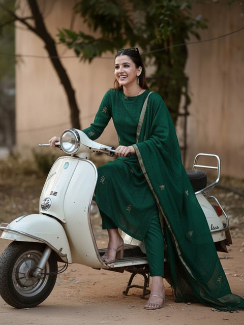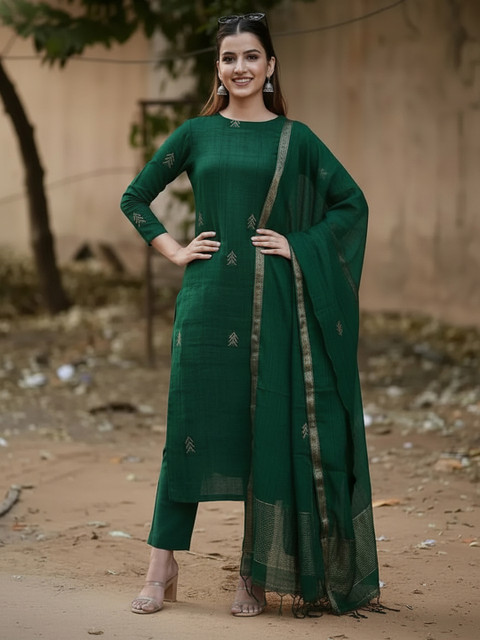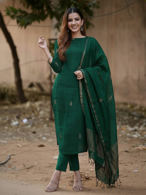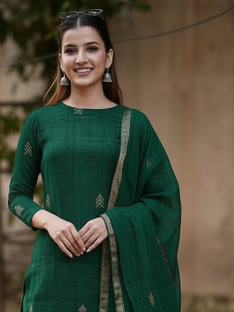Green self design Kurta with Trousers with dupatta