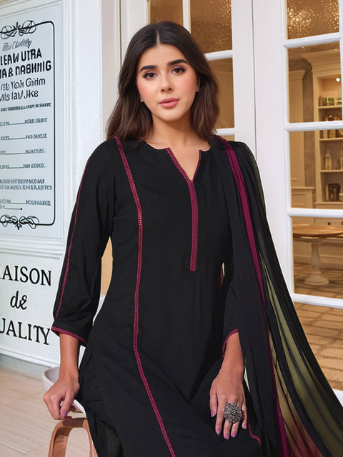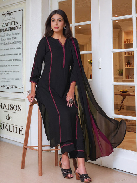 Black & Purple Solid Kurta with Palazzo & Dupatta
