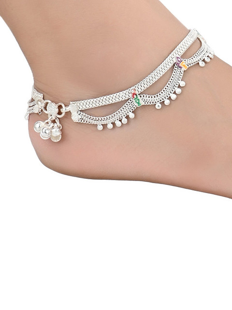 Silver-plated red & green stone studded & beaded anklets