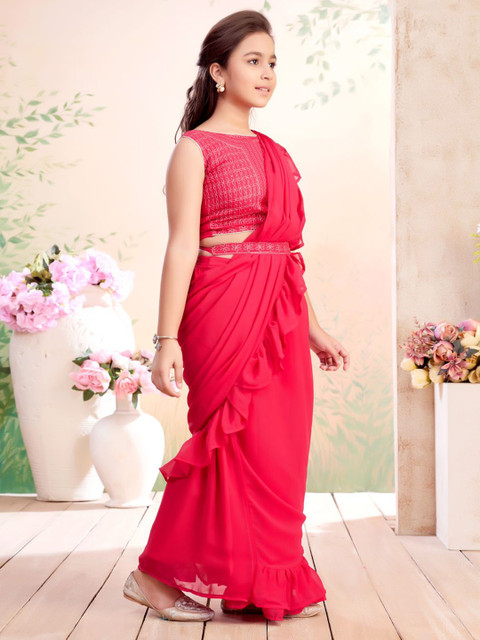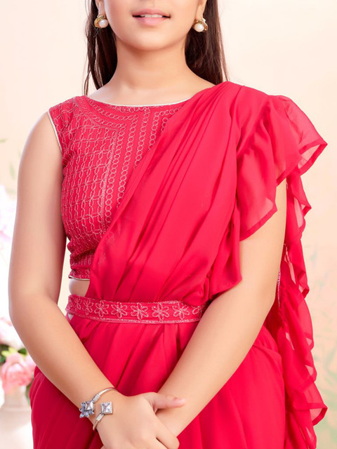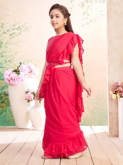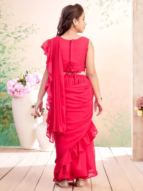 - Pink solid lehenga saree with ruffle detail attachable dupatta