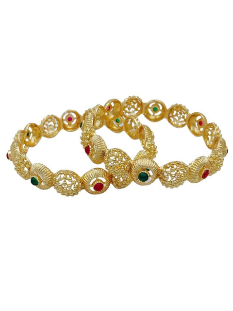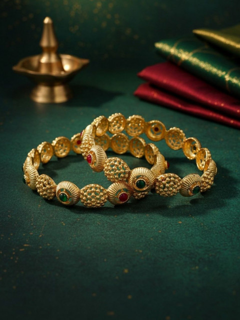 Elevate your ethnic elegance with these gold-toned Kundan bangles, featuring intricate openwork and sparkling stone detailing. Perfect for weddings, festive celebrations, and traditional occasions, they pair beautifully with silk sarees, lehengas, and embroidered anarkalis.