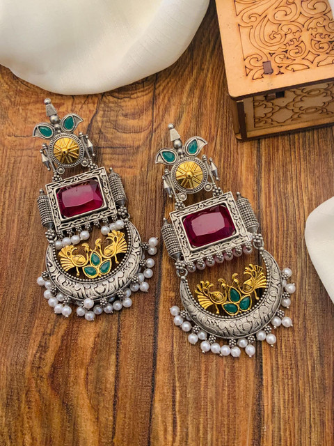 Silver-toned and red classic drop earrings, silver-plated, has artificial stones and beads