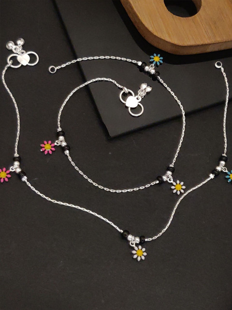 Silver-toned, pink & green silver-plated artificial stones and beads Studded anklet s-hook closure