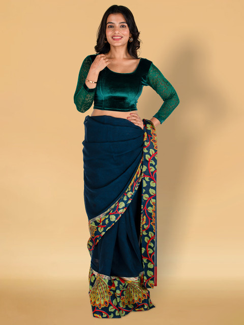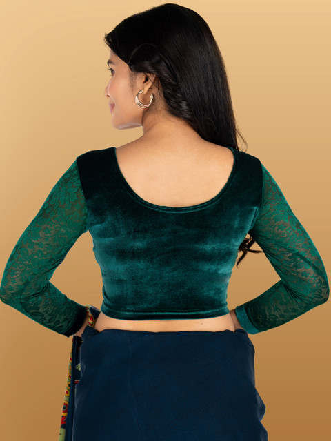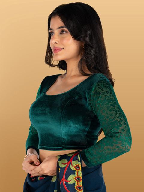 Green floral self design blouse, has round neck, has three quarter sleeves.