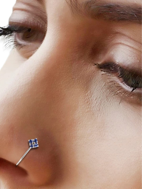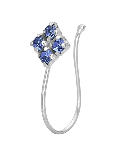 Silver-toned, blue cubic zirconia studded clip on nose pin