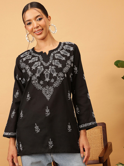 Black and white chikankari embroidered straight kurti, has a notched round neck, long sleeves, straight hem, side slits