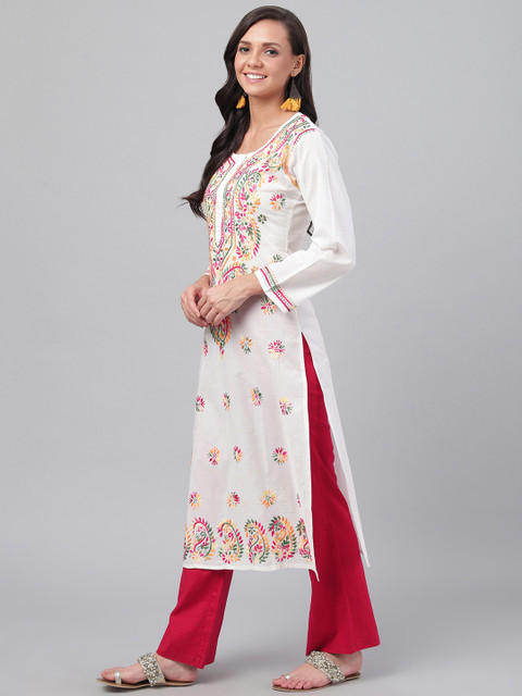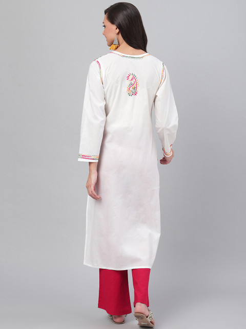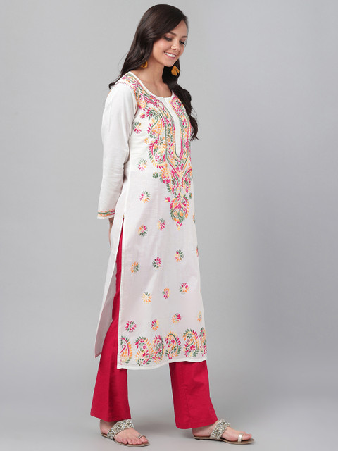 White, pink and green chikankari embroidered straight kurta, has a round neck, three-quarter sleeves, straight hem, and side slits