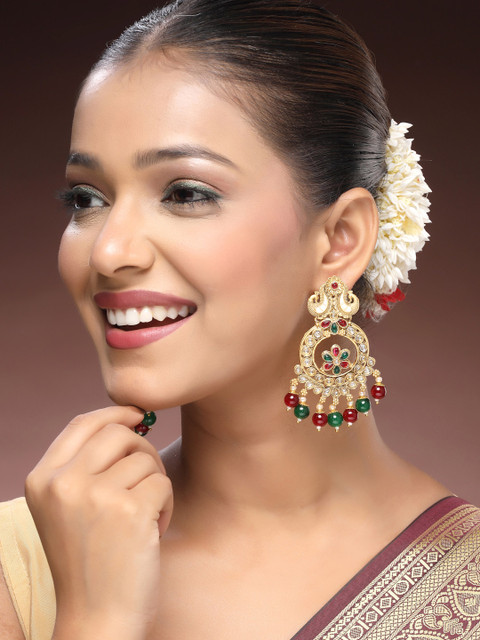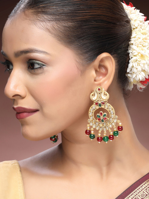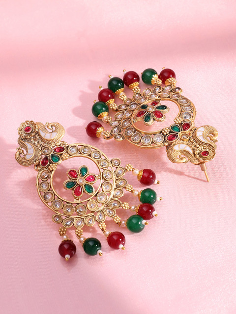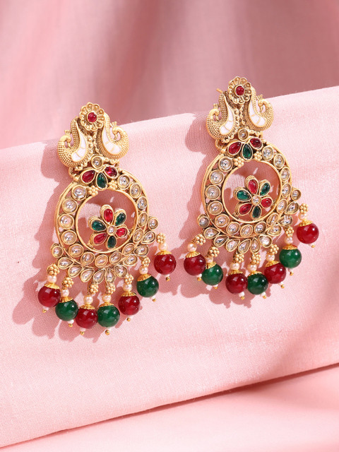Gold-toned peacock shaped drop earrings, gold-plated,red and green drop earrings, has studded and beaded details