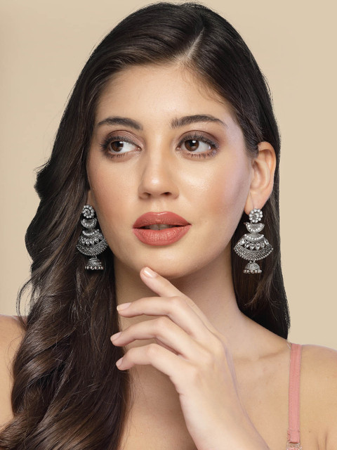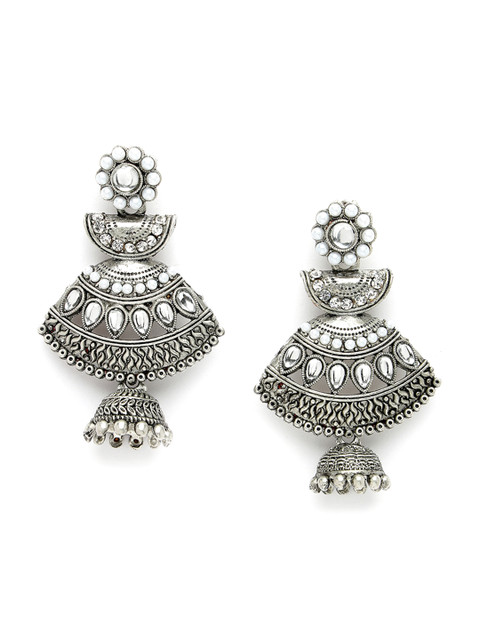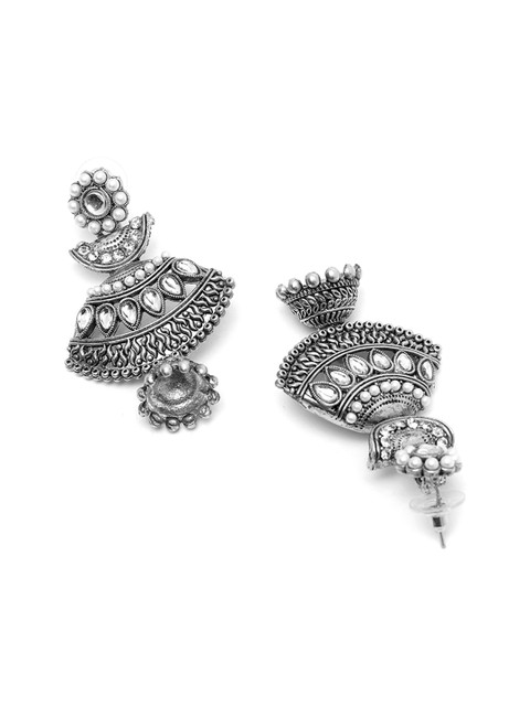 Silver-toned dome shaped jhumkas, silver-plated, has kundan