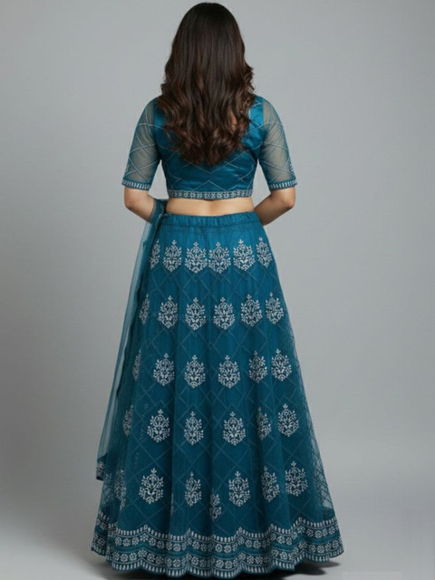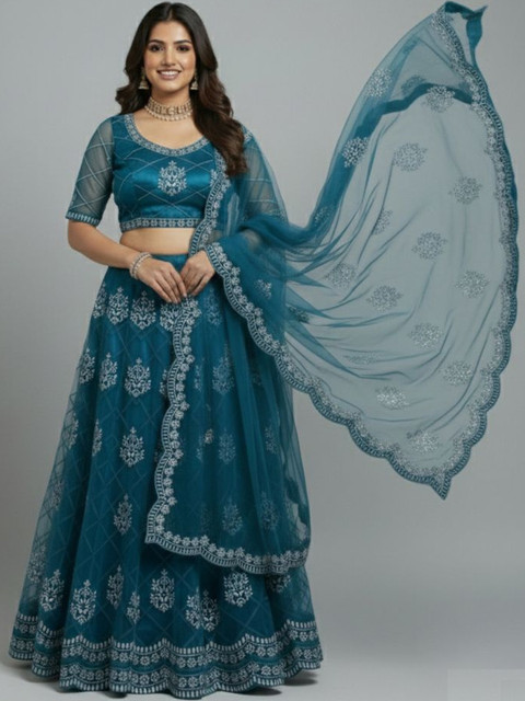 Turquoise blue embroidered lehenga choli with dupatta, thread work