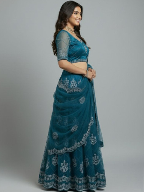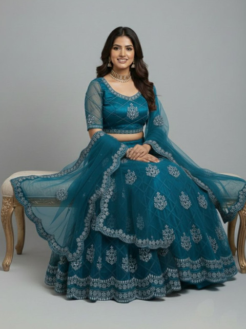 Turquoise blue embroidered semi-stitched blouse, has a round neck, short sleeves, turquoise blue embroidered semi-stitched lehenga, flared hem