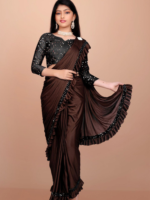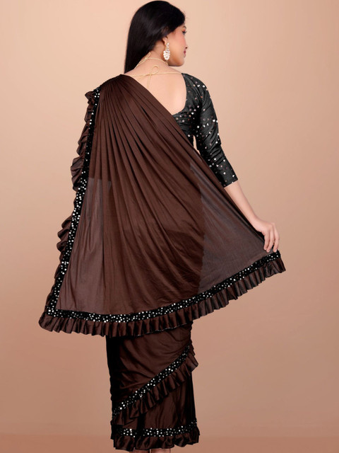 Ready To Wear Saree, Fabric: Lycra, Work : Squence Embroidered, Saree Length of 3.25 meters in Coffee Color, The saree comes with a blouse piece 0.25 meter Velvet Squence Embroidered Work. It is unstitched and can be altered according to your fit and style that you require.