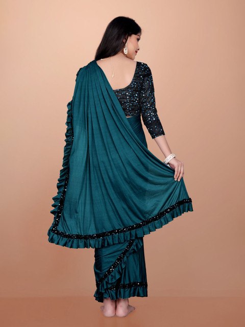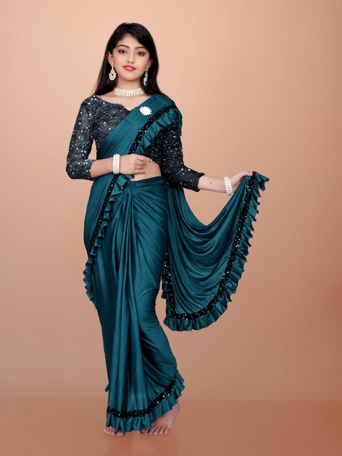 Ready To Wear Saree, Fabric: Lycra, Work : Squence Embroidered, Saree Length of 3.25 meters in Rama Color, The saree comes with a blouse piece 0.25 meter Velvet Squence Embroidered Work. It is unstitched and can be altered according to your fit and style that you require.