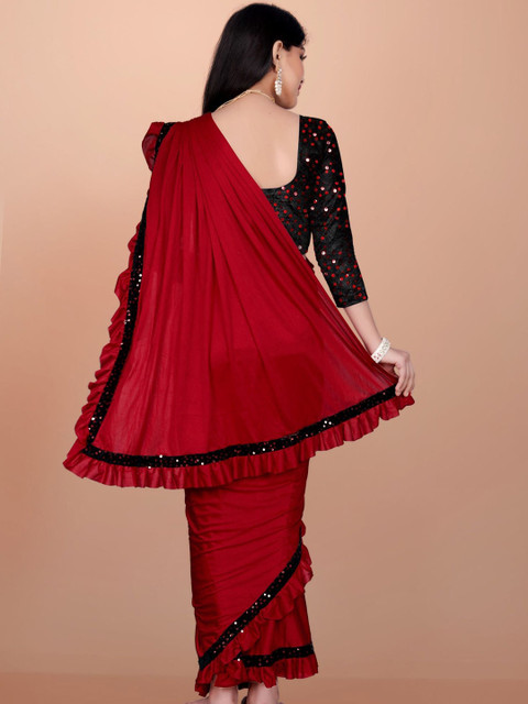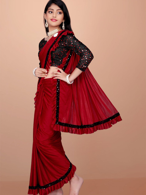 Ready To Wear Saree, Fabric: Lycra, Work : Squence Embroidered, Saree Length of 3.25 meters in Red Color, The saree comes with a blouse piece 0.25 meter Velvet Squence Embroidered Work. It is unstitched and can be altered according to your fit and style that you require.