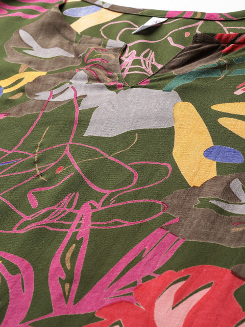 • Green and multicoloured floral print Tunic, has a round neck, has three-quarter, regular sleeves