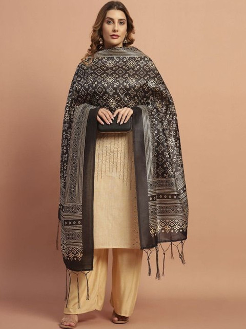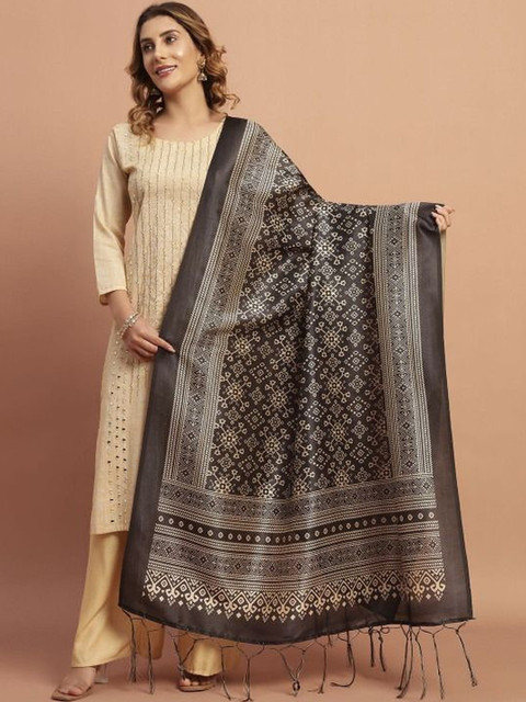Black ethnic motifs printed dupatta, tasselled border