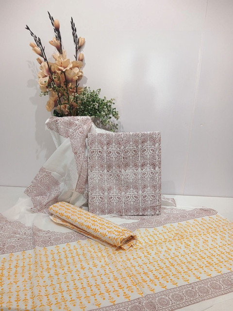 Hand Block Printed cotton salwar suit fabric is meticulously printed by skilled artisans, ensuring unique and intricate patterns that exude charm and sophistication.Made from high-quality cotton fabric. Experience utmost comfort all day long, whether youre attending a casual gathering or a festive occasion.This suit material comes in unstitched form, allowing you to tailor it accordingto your measurements and preferences. size- 2.5 mtr kurta fabric, 2.5 mtr salwar fabric, 2.5mtr dupattafabric.