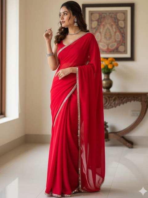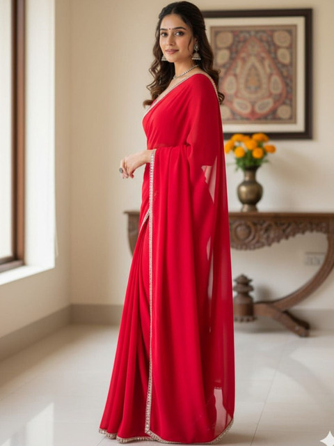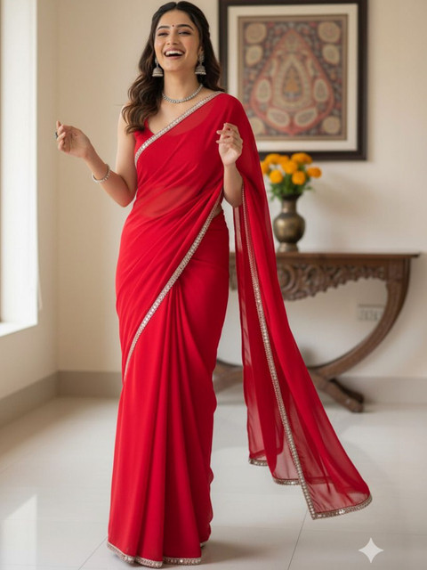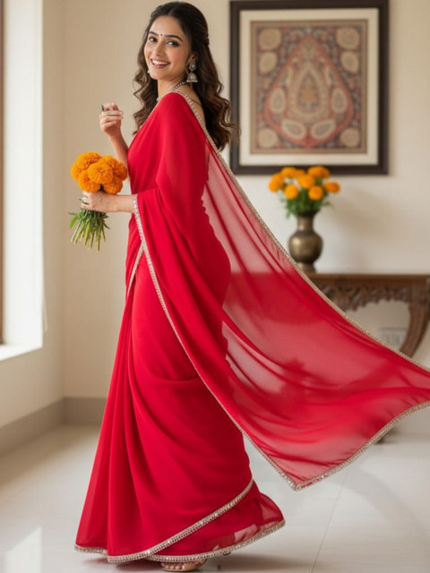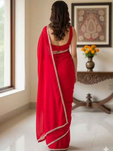 This saree is the epitome of “less is more”a sophisticated piece that leverages the dramatic impact of solid red and the sparkle of silver embellishments. The fluid fabric ensures an effortless and flattering drape.