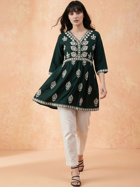 Team this short kurti with slim-fit trousers or straight jeans and oxidized Jhumkas for a chic Indo-western look