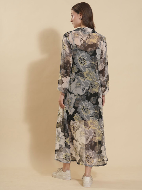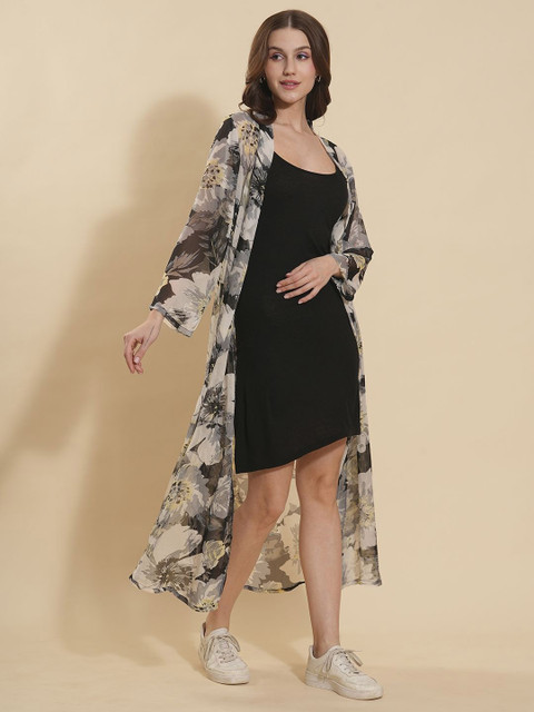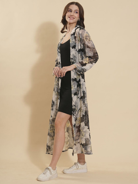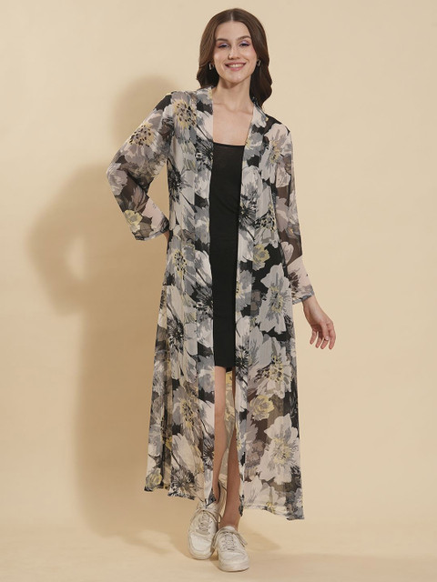 Black and grey floral printed open front longline shrug ,has long sleeves, straight hem, has v-neck