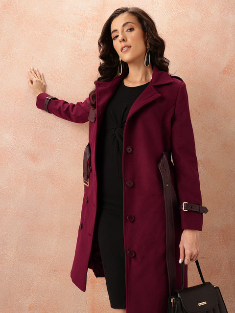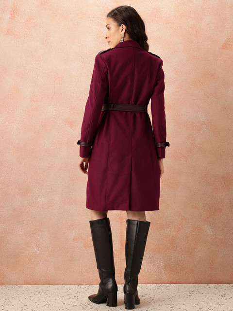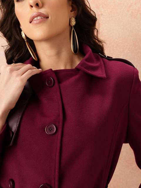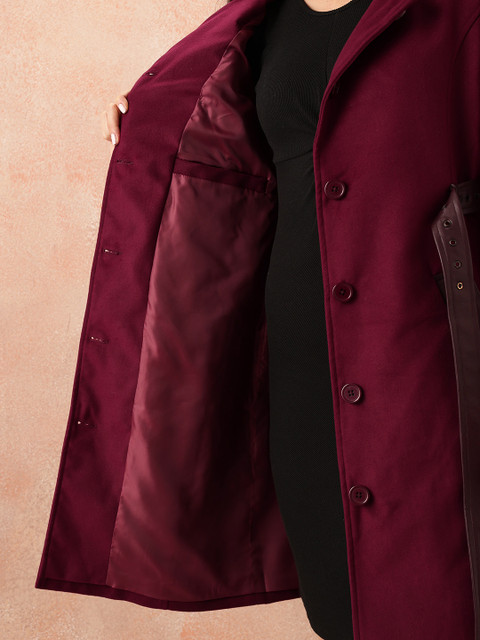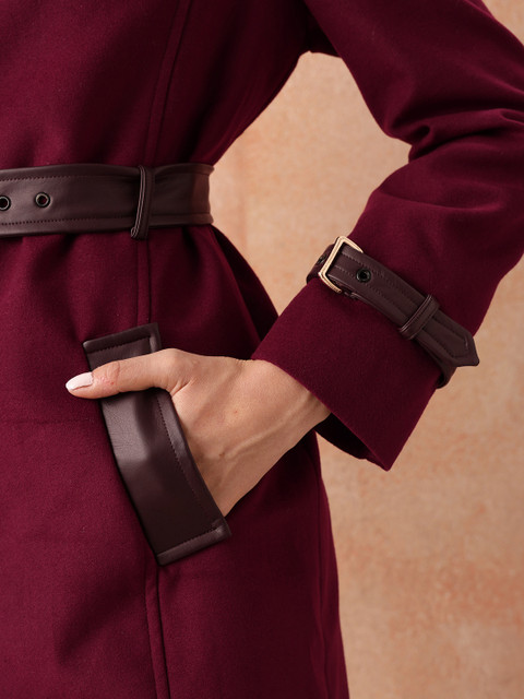 Burgundy coloured overcoat with faux leather detail, spread collar, 3 pocket, knee length, button closure, polyester lining, comes with a detachable belt