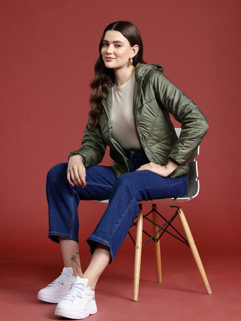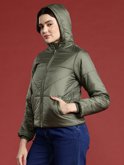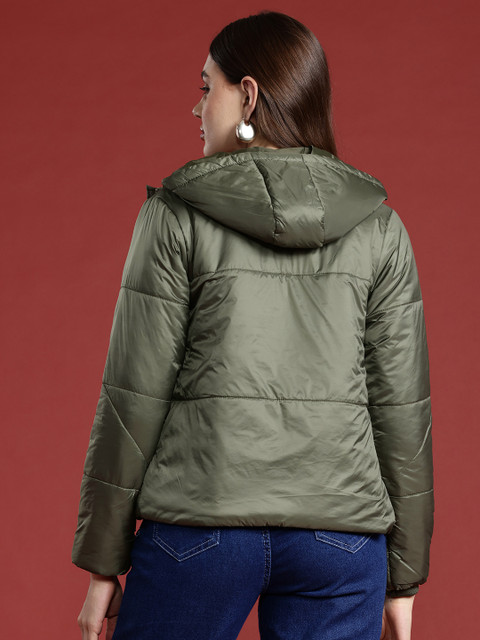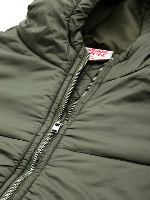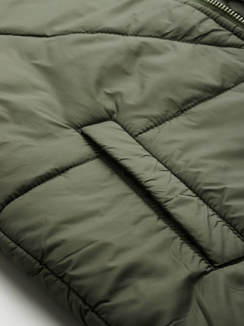 Olive green solid padded jacket, has a hooded neck, 2 pockets ,has a zip closure, long sleeves, straight hemline, polyester lining