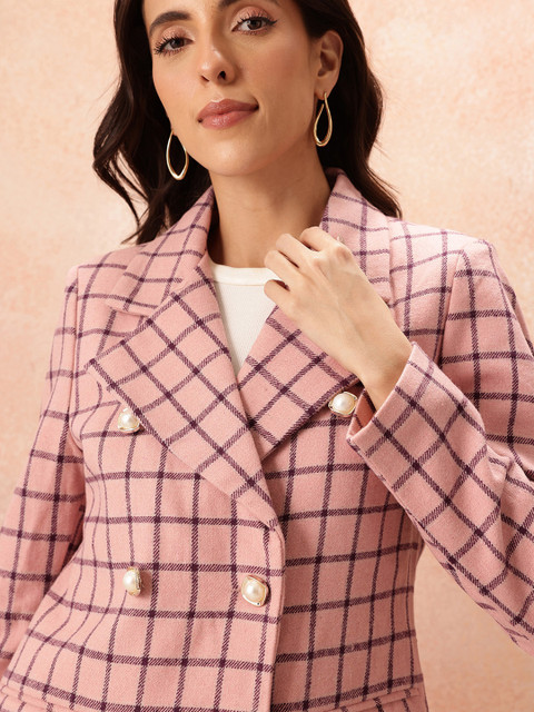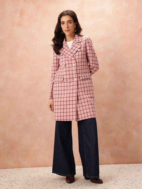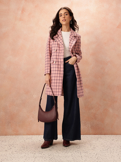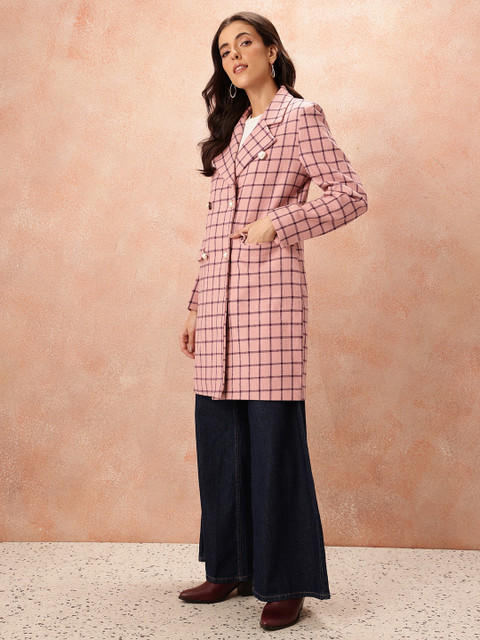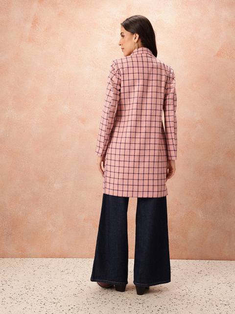 Pink and Burgundy checked overcoat, has a notched lapel collar, long regular sleeves, straight hem