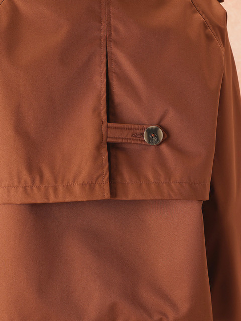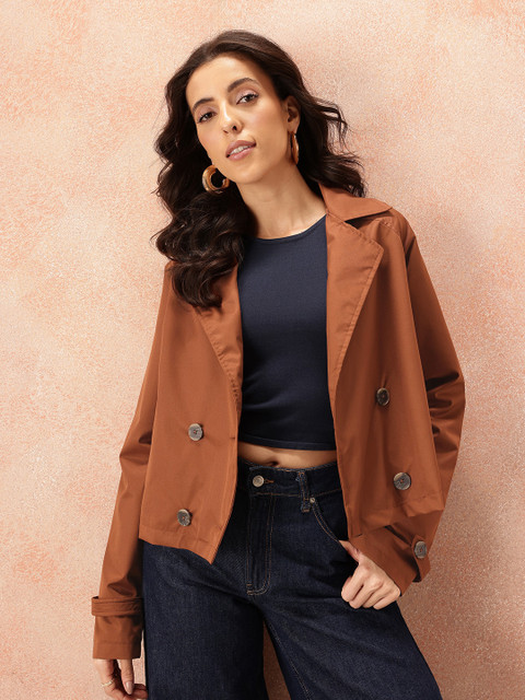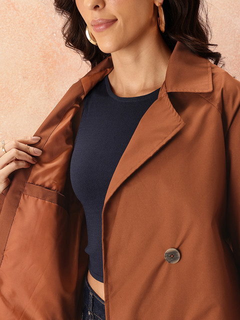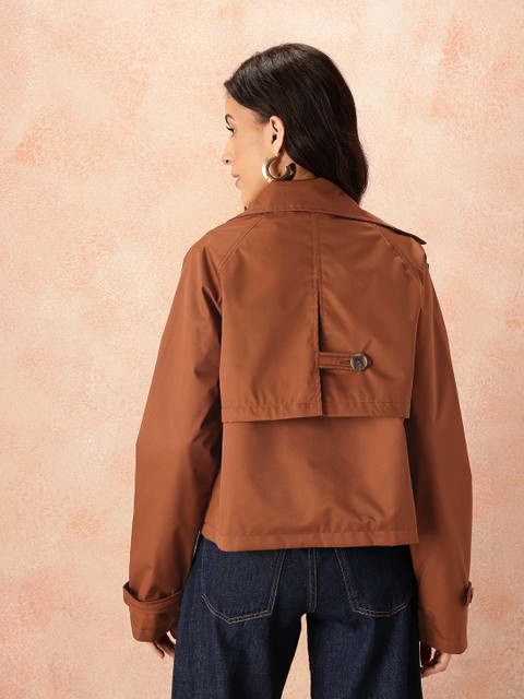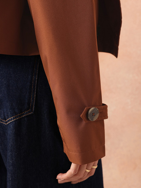 Rust Brown double-breasted layered coat has a notched lapel collar, long sleeves with tab detail, straight hem, and button and tab detail on the back